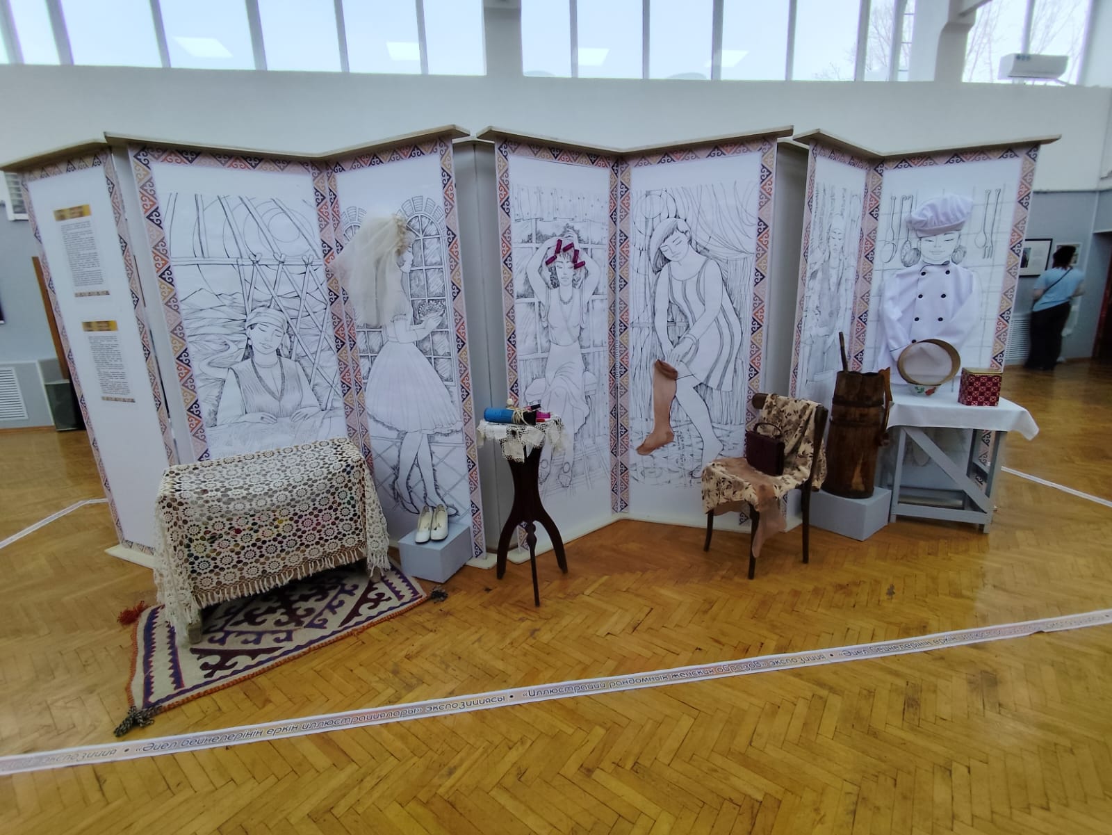 В центре выставочного зала была сформирована композиционная экспозиционная зона, где вокруг авторских графических работ размещены фондовые экспонаты. Каждый музейный предмет — элемент одежды, аксессуар, бытовая или декоративная деталь — стал отправной точкой для создания художественного образа женщины. На основе музейных предметов были созданы графические иллюстрации, которые раскрывают возможную историю, настроение и образ времени, связанный с данным предметом.